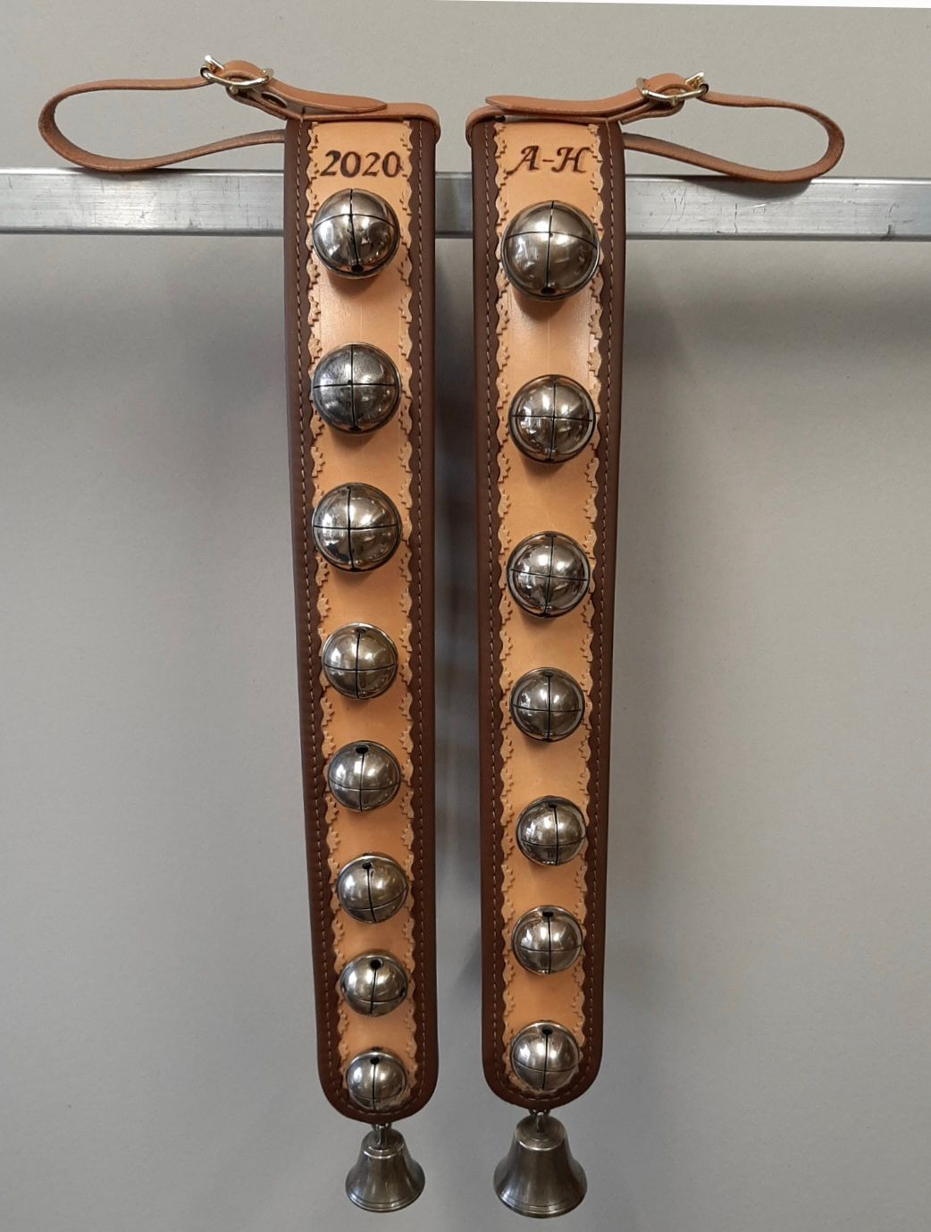 Nos courroies de cloche se distinguent par leur décoration unique, avec des options de peintures, de broderies et de gravure du cuir, pour un rendu personnalisé et élégant.